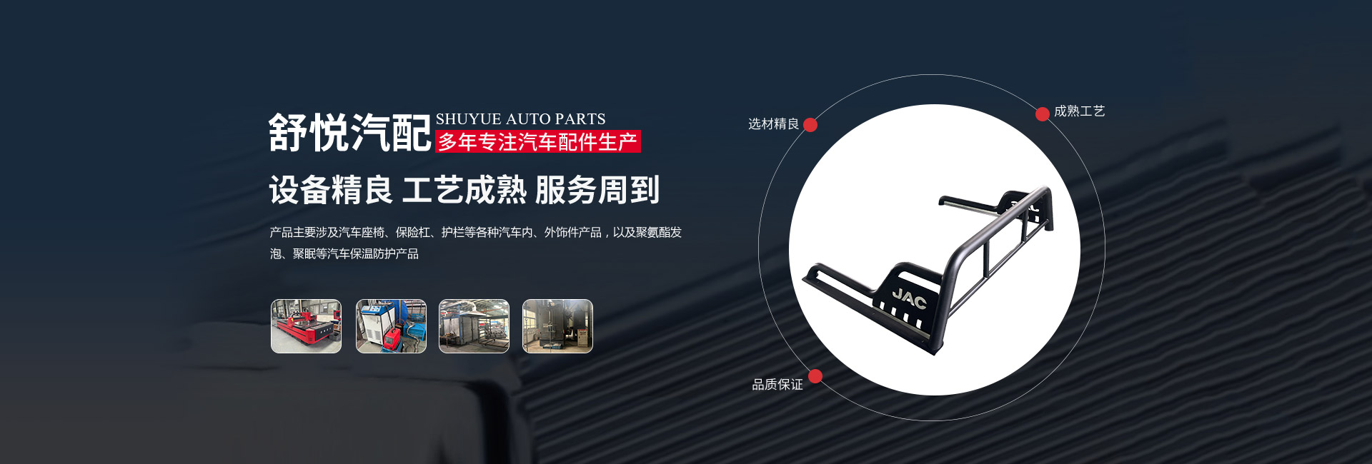 揚州舒悅汽配有限公司經過多年的穩(wěn)定發(fā)展,業(yè)績一直蒸蒸日上。公司產品主要涉及汽車座椅、保險杠、護欄等各種汽車內、外飾件產品,以及聚氨酯發(fā)泡、聚脲等汽車保溫防護產品。其主要是為江淮、金龍,奇瑞等公司服務,已連續(xù)多年成為江淮、金龍等公司的A級供應商。        公司成立于1997年,現(xiàn)坐落于揚州市儀征劉集盤古工業(yè)集中區(qū)202號,公司占地面積26640平 方米,廠房建筑面積18512平方米。公司擁有先進的制造設備、可靠的生產工藝、完善的檢測手段和科學的管理,在售前和售后服務中做到快速反應,應急應變,為客戶提供優(yōu)良產品和滿意服務。公司的產品開發(fā)能力和生產規(guī)模在同行業(yè)中處于前列的地位。        揚州舒悅人秉承“誠信雙嬴”的原則,發(fā)揚“誠信、務實、創(chuàng)新、貢獻”的企業(yè)精神,恪守“顧客至上”的經營宗旨,致精從業(yè),不斷引進新技術、新材料。以優(yōu)良的產品、合理的價格和周到的服務參與市場競爭。公司愿與國內外朋友建立真誠的合作伙伴關系,攜手共創(chuàng)輝煌!